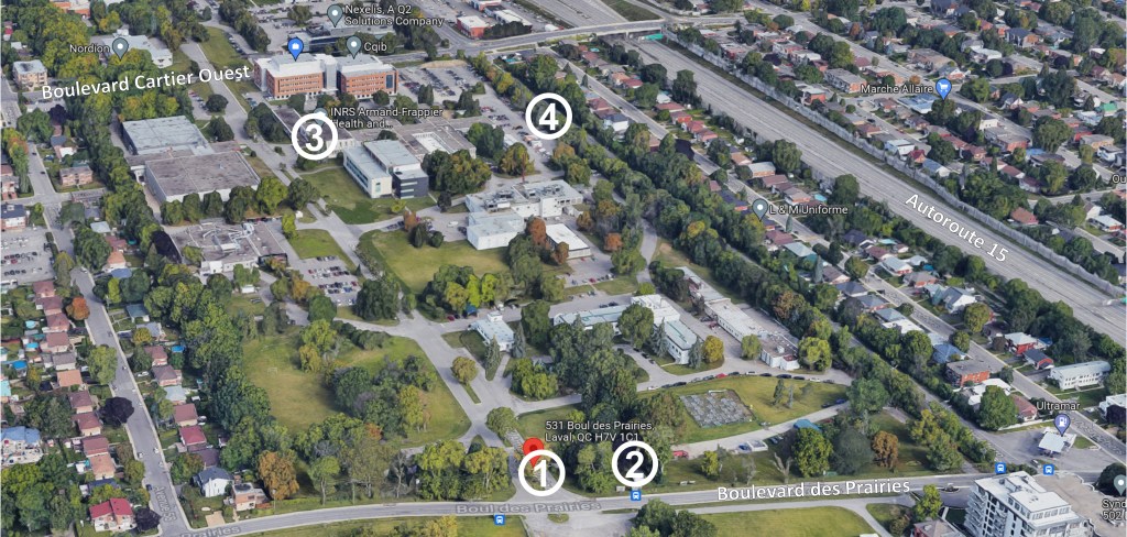 - To access campus via public transit, take the #20 bus (towards Chomedey) from Cartier metro station. Get off of the bus at the “Des Prairies/Armand-Frappier” stop. Otherwise, take the #24 bus (towards St. Dorothée) from Cartier metro station, and get off at the “Cartier/Micro” stop; then walk south on Avenue Micro (careful, there is no sidewalk!), then turn right onto Boul. des Prairies to reach the main gate. (You cannot access campus via Boulevard Cartier Ouest unless you have keycard authorization).